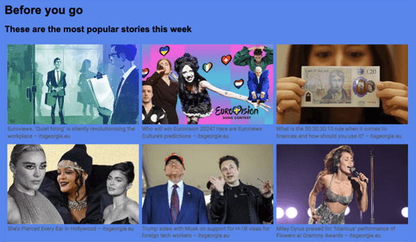 This test aimed at determining whether presenting auto-optimized content recommendations through an exit-intent modal (check the example below) - a message triggered when users show signs of leaving the site - could effectively reduce single-page visits and increase overall pageviews among first-time visitors.